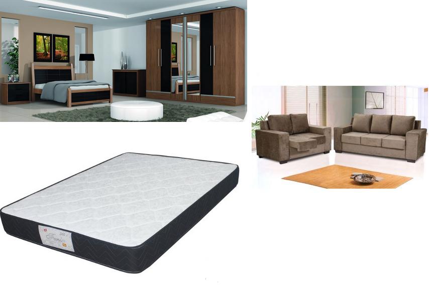 FOTO MERAMENTE ILUSTRATIVA - 01 jogo de quarto completo – imbuia, amêndoa e preto composto de: 1 roupeiro, 01 cama de casal, 01 cômoda, 02 criados mudo, 01 colchão de casal, 01 conjunto de sofá 2/3 lugares, retrátil, 01 estante Valdmóveis Da Vinci Nogueira.